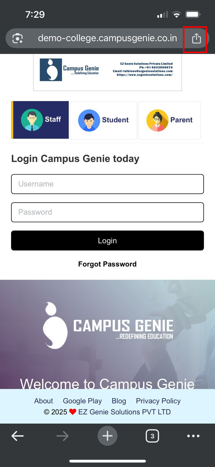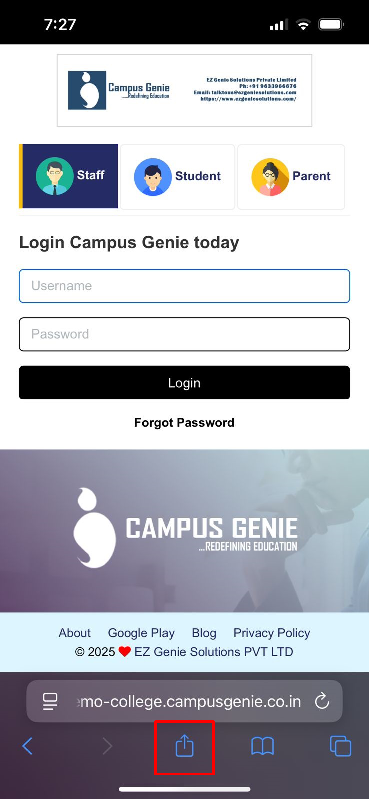 Safari browser on your mobile and type your campus url (https://akvb.campusgenie.co.in) in the search bar, and click on the share icon