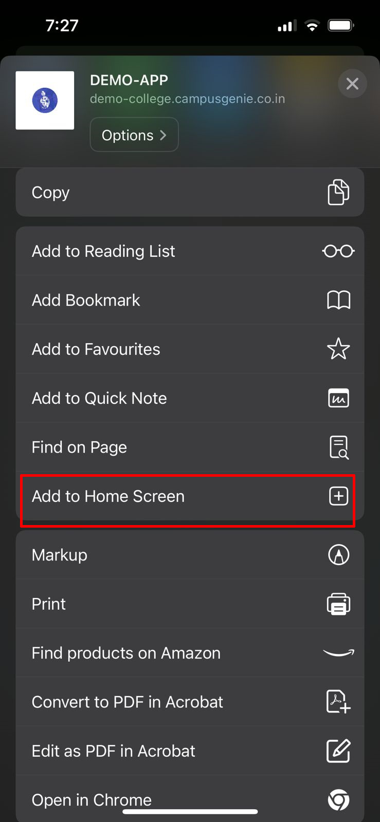 Click on the option Add to home screen